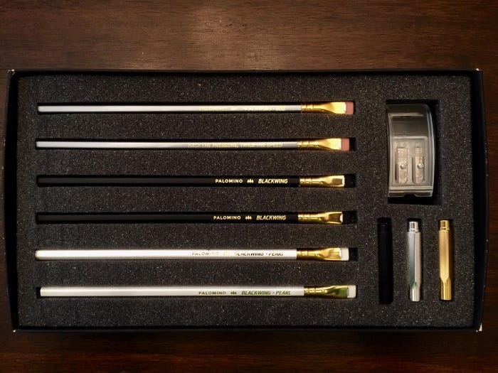 Blackwing에서 제작하는 연필에는 여러 종류가 있는데 일반적으로 Blackwing Starting Point Set가 처음 Blacking 연필을 사용하는 사람들에게는 인기가 있다고 한다. Blackwing Starting Point에는 다음의 물품들이 포함되어 있다.