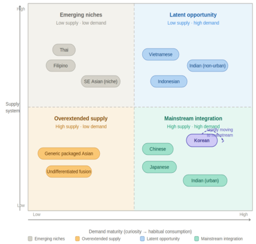 Figure 1. Asian Food Market Evolution: Supply–Demand Matrix (positions indicative; Korean cuisine transitioning toward mainstream integration).