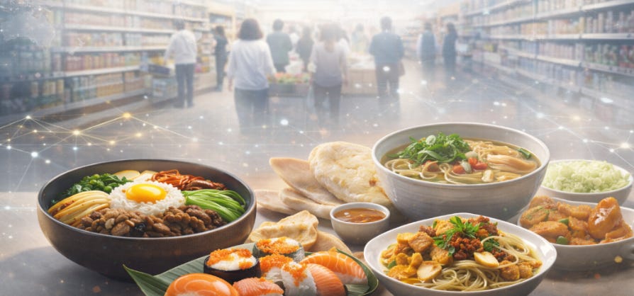 Diverse Asian cuisines now fill everyday supermarket shelves, reflecting the shift from cultural exposure to habitual global consumption.