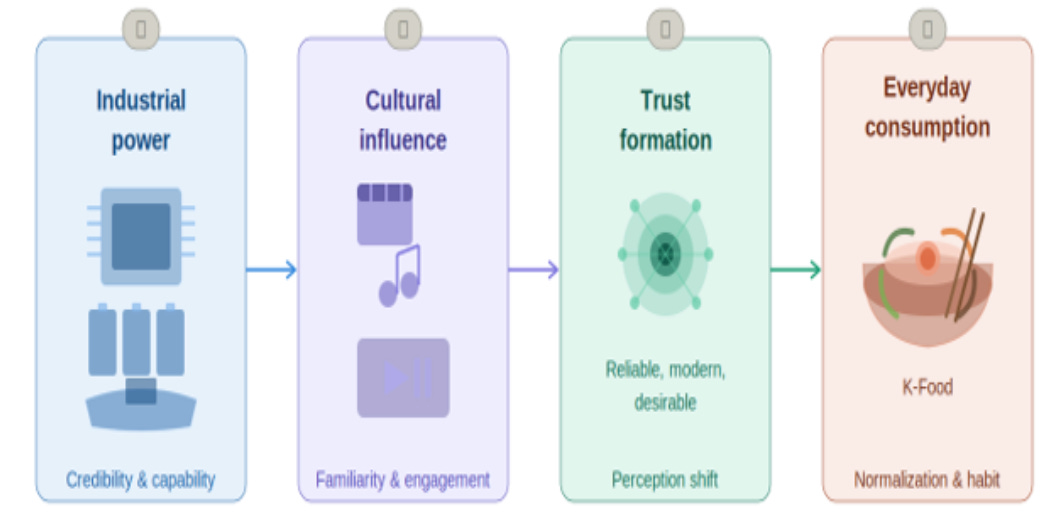Over time, these forces converged into a broader shift in perception. Korea came to be seen not only as industrially competent but also as modern, reliable, and desirable. This trust extended naturally into consumption, where K-food moved from novelty to routine. Dishes such as ramyeon, bibimbap, and Korean fried chicken entered global markets as everyday choices rather than exotic experiences. This progression reflects a reinforcing system: industrial credibility builds trust, cultural familiarity deepens it, and together they enable the normalization of K-food in daily life.