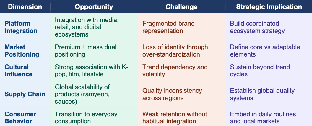 At the same time, K-food benefits from a unique positioning that spans both premium and mass markets. On one end, it can be elevated through fine dining reinterpretations, wellness-oriented narratives rooted in fermentation and balance, and cultural storytelling that emphasizes authenticity. On the other, it scales globally through standardized products such as ramyeon, kimchi, and sauces that are widely accessible across retail channels. This dual positioning—simultaneously aspirational and everyday—creates a strategic advantage that is difficult to replicate. As Table 1 suggests, this requires careful calibration between maintaining cultural identity and enabling global scalability, as well as embedding consumption into daily routines rather than relying on short-term trends. Together, these dynamics position K-food not merely as a cultural export, but as a strategic domain where cultural identity is translated into sustained global economic and experiential value.