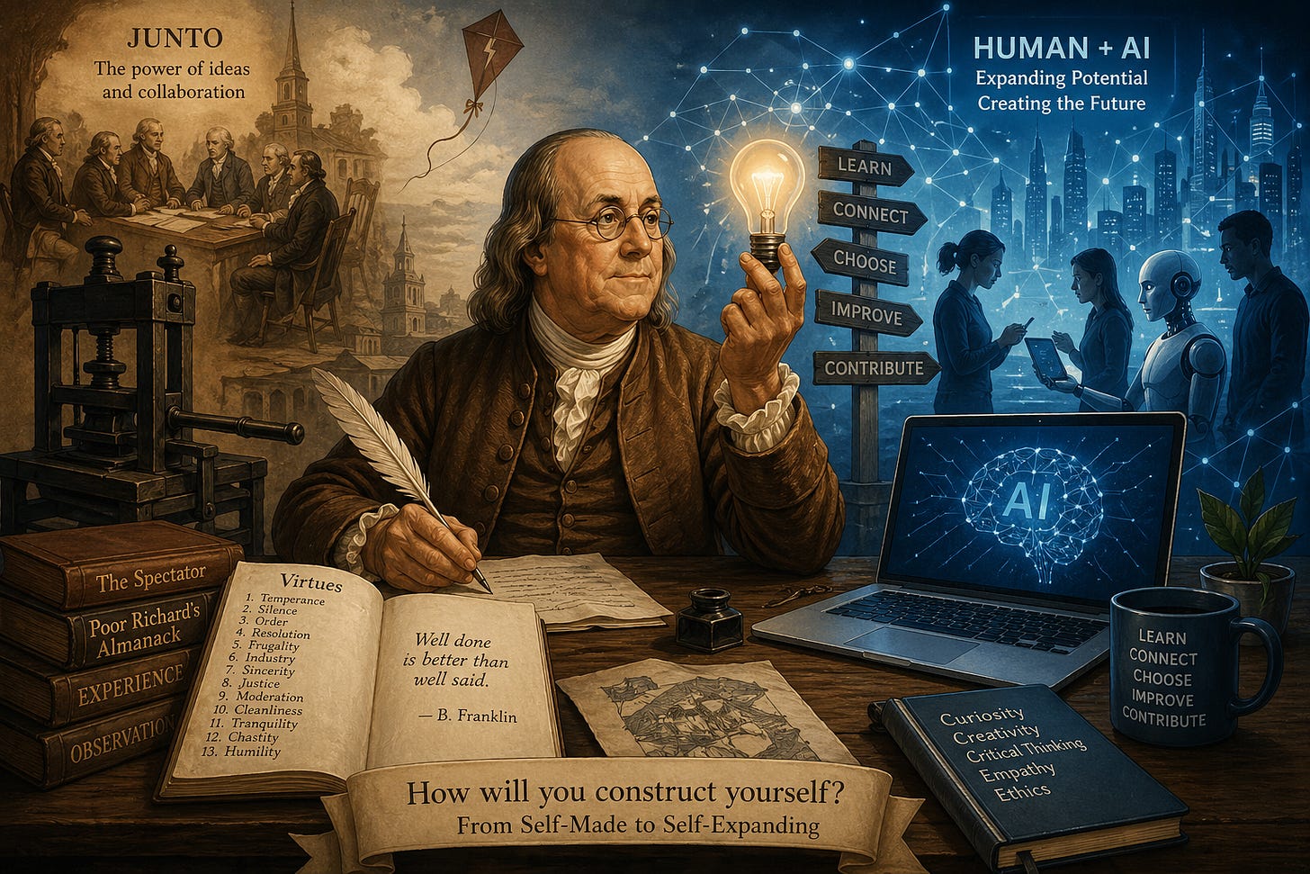 The eighteenth-century figure Benjamin Franklin is often celebrated as the archetype of the “self-made man.” Yet his true greatness lies not merely in rising from humble beginnings, but in his continual act of self-construction. He was not simply self-made; he was self-designed—a man who persistently shaped and reshaped his own identity. Today, we stand at another historical inflection point: an era in which human capabilities are amplified through artificial intelligence. What, then, can Franklin’s life teach us about the ideal human in the age of AI?