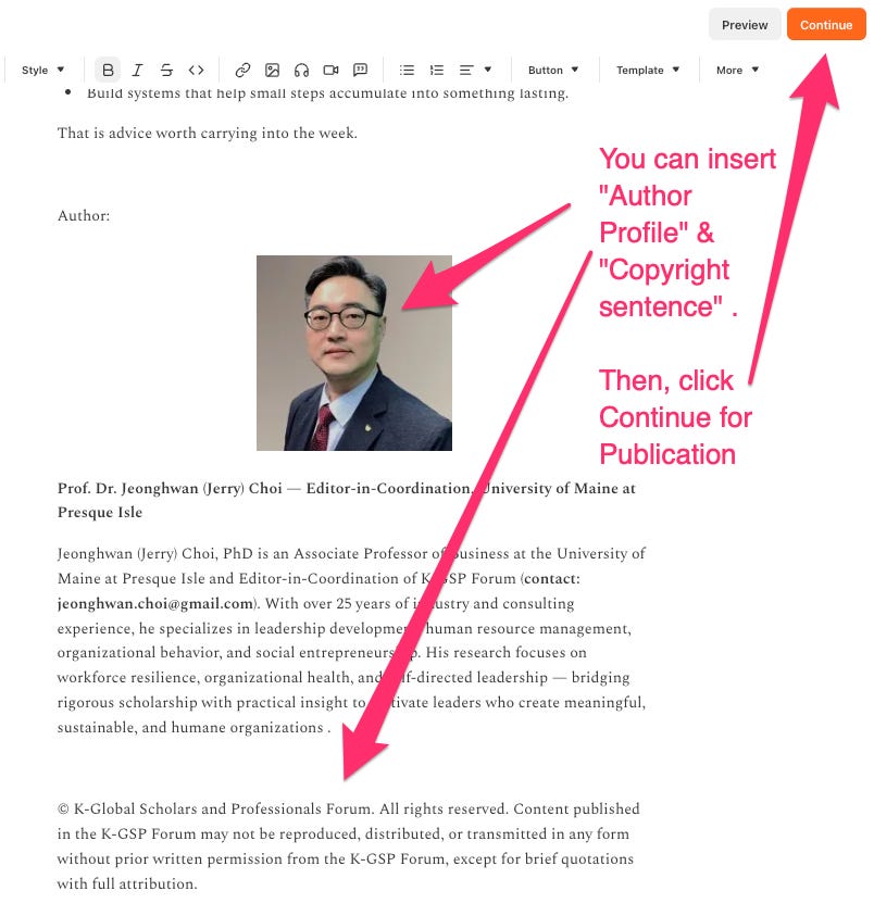 At the end of your article, insert a brief author profile introducing yourself to readers. Below that, add the following standard K-GSP Forum copyright notice: © K-Global Scholars and Professionals Forum. All rights reserved. Content published in the K-GSP Forum may not be reproduced, distributed, or transmitted in any form without prior written permission from the K-GSP Forum, except for brief quotations with full attribution. Once these are in place, click Continue to proceed to the publication settings.