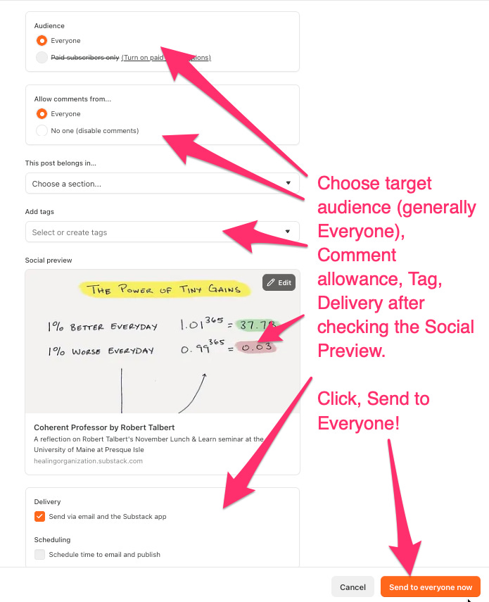 In the publication settings panel, make the following selections. For audience, choose Everyone to make your article publicly accessible to all readers. For comments, select your preferred setting — allowing comments is recommended to encourage community engagement. Add relevant tags to help readers find your article by topic. Check the Social Preview to confirm that your title, subtitle, and cover image appear correctly for sharing on social media and email. When everything looks good, click Send to Everyone to publish.