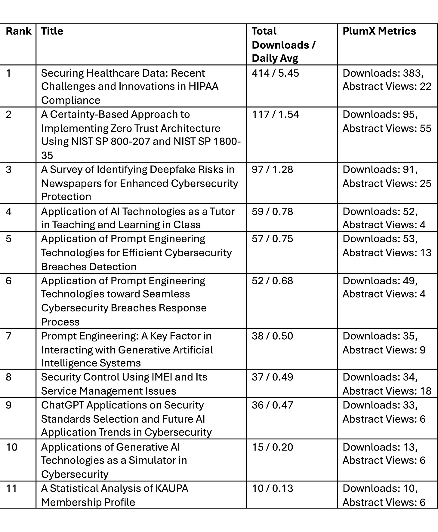 Keywords: KAUPA Letters, PlumX Metrics, downloads, Korean American professors, article popularity, AI, cybersecurity, healthcare
