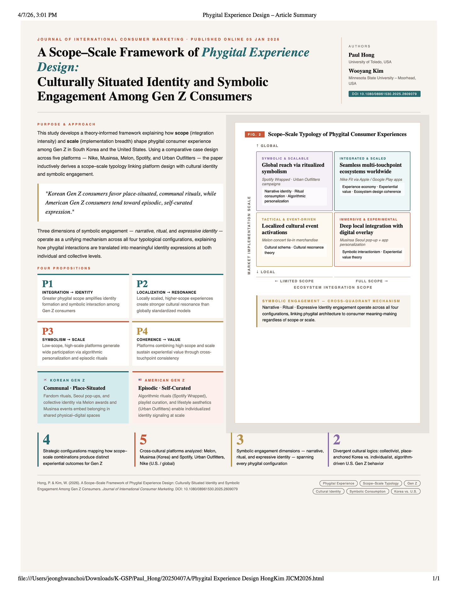 Hong, P. & Kim, W. (2026). A Scope–Scale Framework of Phygital Experience Design: Culturally Situated Identity and Symbolic Engagement Among Gen Z Consumers. Journal of International Consumer Marketing. DOI: 10.1080/08961530.2025.2609079