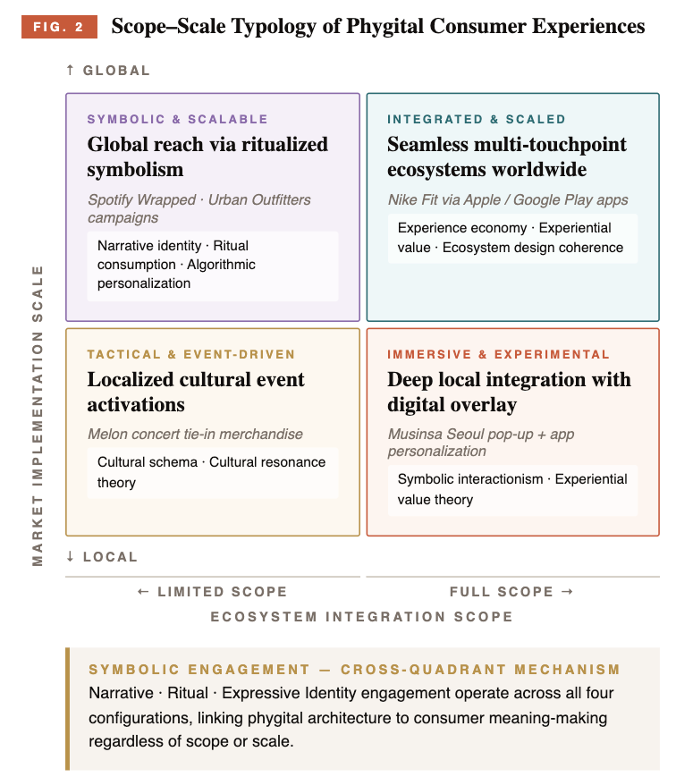 This study develops a theory-informed framework explaining how scope (integration intensity) and scale (implementation breadth) shape phygital consumer experience among Gen Z in South Korea and the United States. Using a comparative case design across five platforms — Nike, Musinsa, Melon, Spotify, and Urban Outfitters — the paper inductively derives a scope–scale typology linking platform design with cultural identity and symbolic engagement.