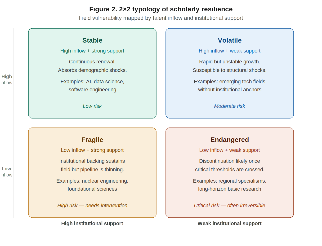 A 2×2 typology categorizes fields by talent inflow and institutional support: Stable, Fragile, Volatile, and Endangered — with endangered fields facing both low inflow and weak backing