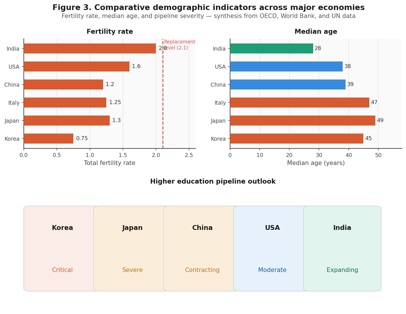 Figure 3 gives the comparative empirical grounding — placing Korea's extreme position in global context and linking demographic severity to pipeline outcomes.