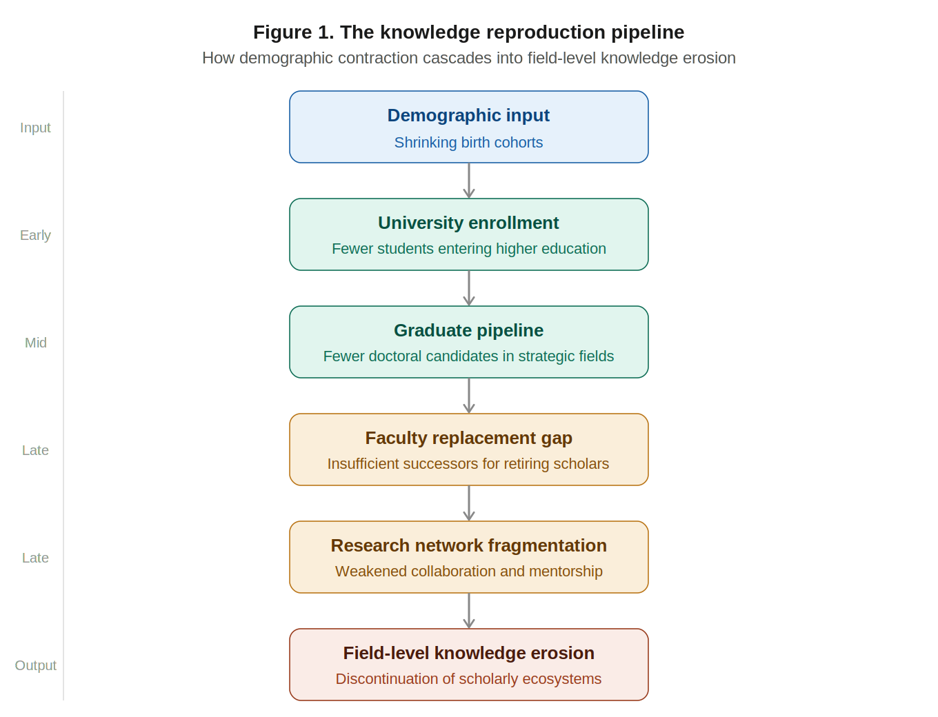 Demographic decline operates through a cascading pipeline: smaller birth cohorts → reduced university enrollment → fewer doctoral candidates → gaps in faculty replacement → fragmented research networks → field-level decline
