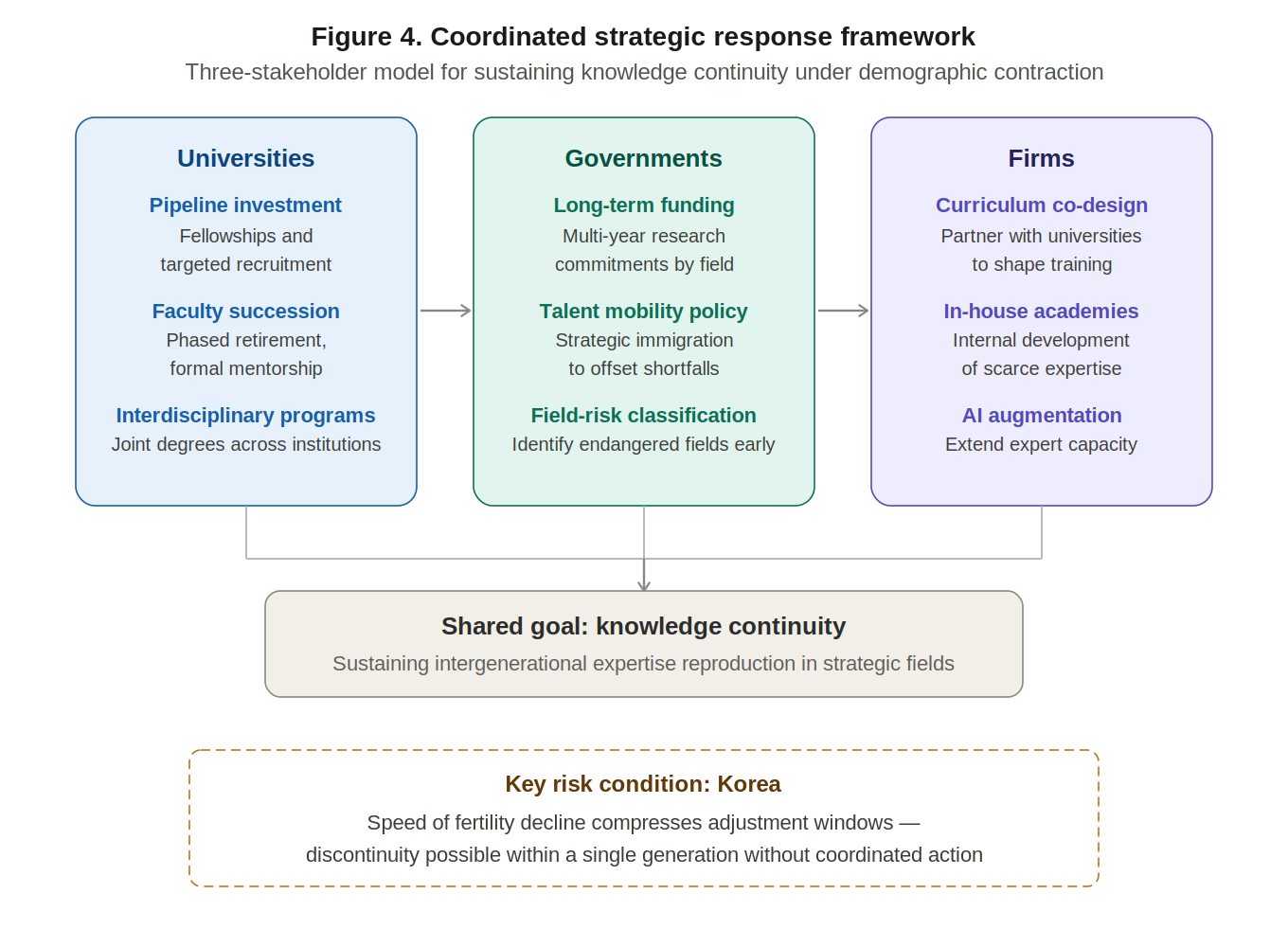 Korea makes this concrete. With the world’s lowest fertility rate — hovering near 0.7 — Korea is not facing a distant demographic scenario. It is living one. Regional universities are closing programs. Doctoral pipelines in engineering and foundational sciences are narrowing. Senior scholars are retiring without adequate successors. What looks like an institutional adjustment problem is, at its core, a knowledge continuity crisis.
