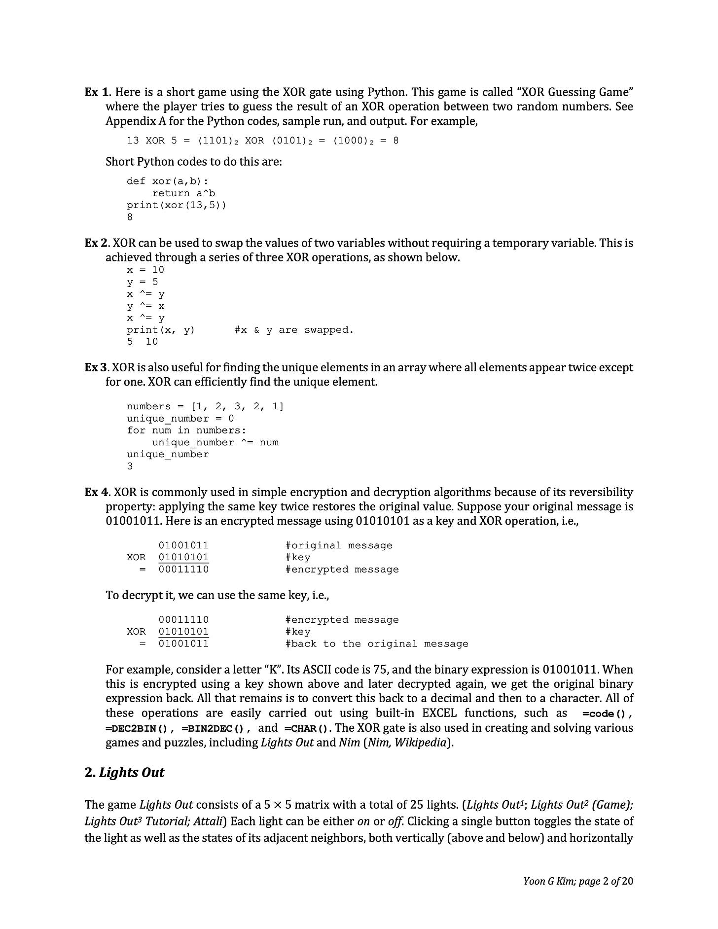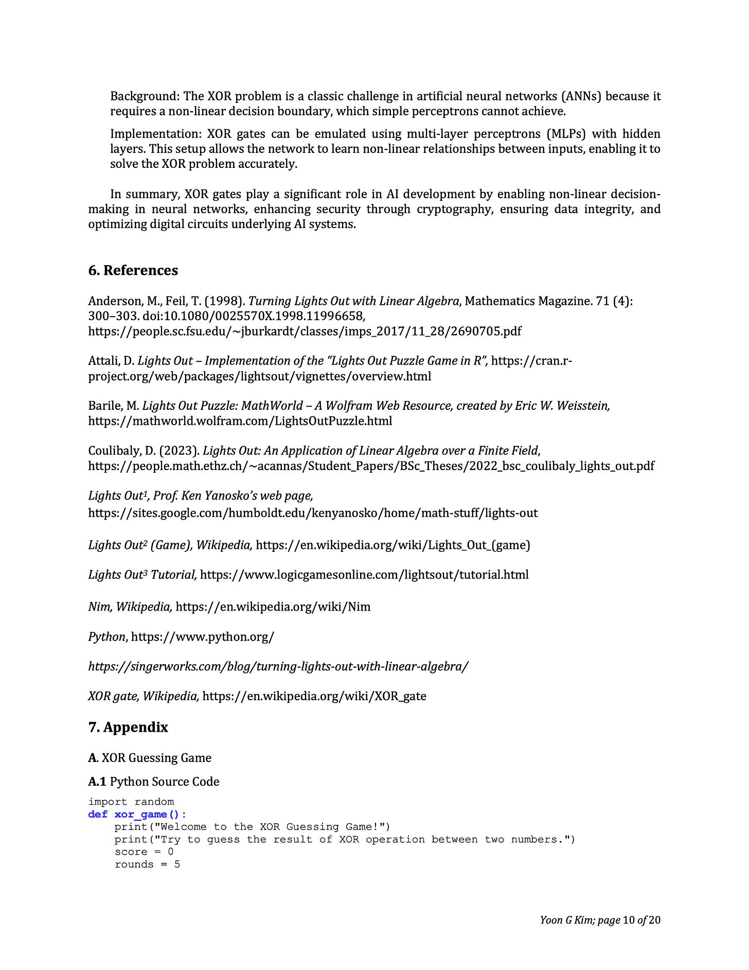 Logic gates serve as the fundamental building blocks of digital circuits, and among them, the XOR (exclusive OR) gate stands out due to its unique properties. The XOR gate outputs true only when the number of true inputs is odd, making it a pivotal element in various applications, especially in the realm of machine learning and AI development. Korean studies at the intersection of digital logic and recreational mathematics have demonstrated how XOR gate principles provide an effective framework for algorithmically solving the Lights Out game. Comparative research conducted in Korea indicates that the puzzle-solving mechanics of the Lights Out game can be effectively analyzed using the same principles that govern XOR gate behavior in digital circuits. We explore how linear algebra can be used to analyze the Lights Out game. The XOR gate can also be used in AI development in several contexts, particularly in areas that involve binary decision-making, error detection, and encryption/decryption. Simple computations, reversibility, symmetry and inversion are some of the useful properties of the XOR gate, which make the XOR gate versatile, popular and applicable across all binary data.