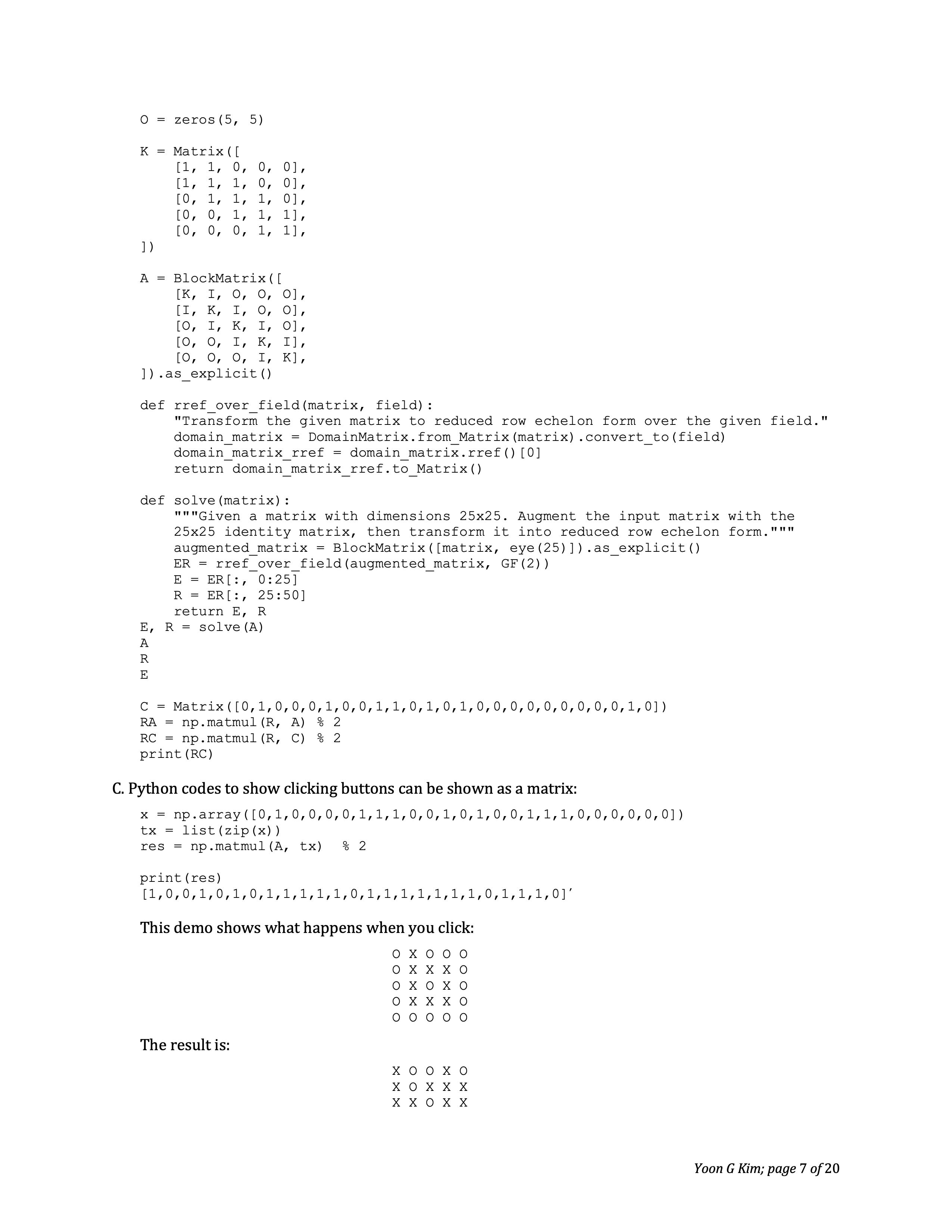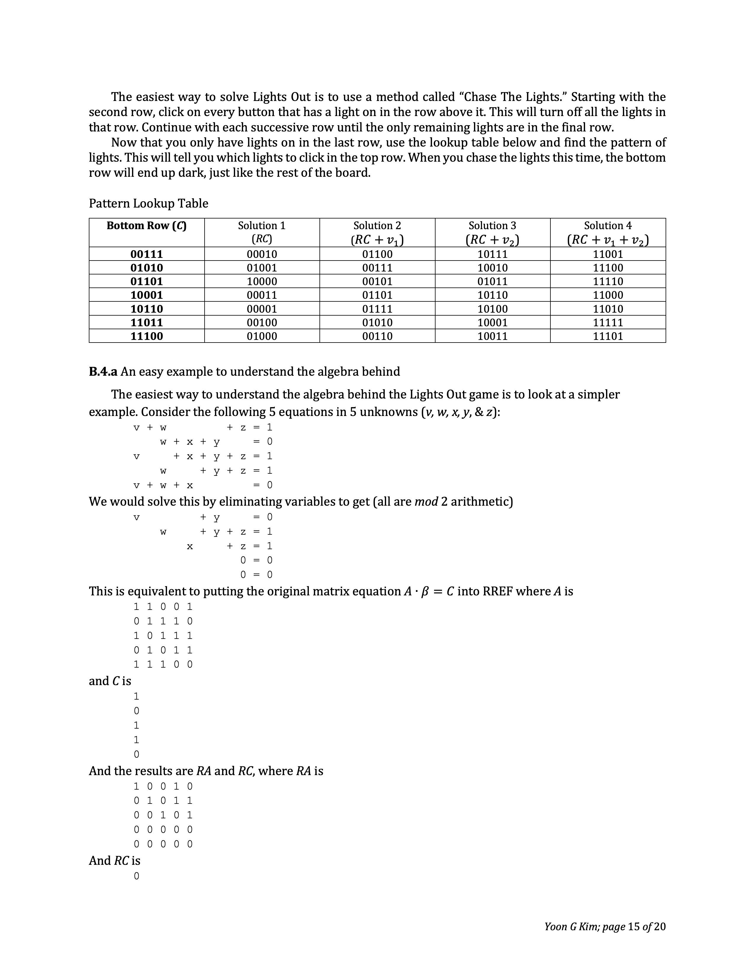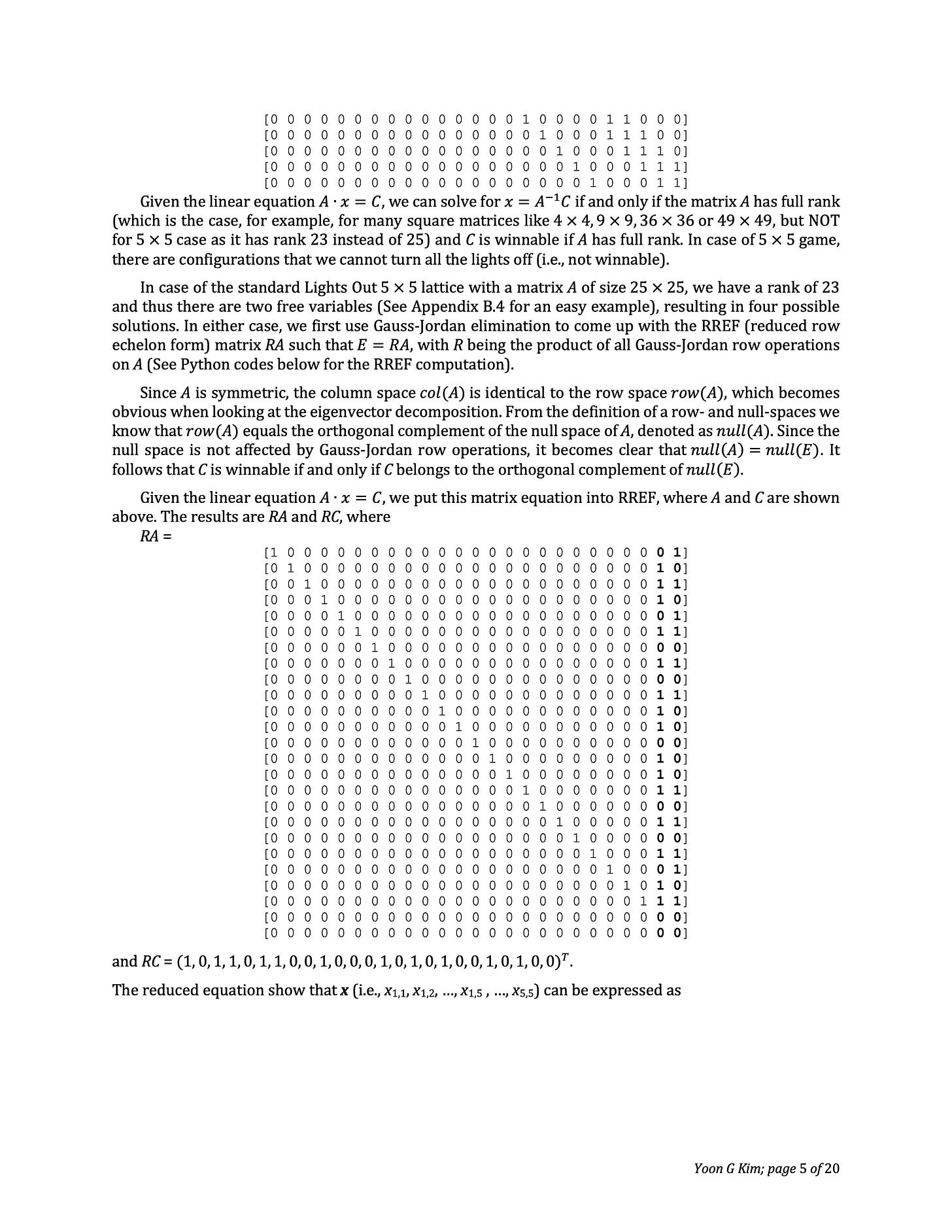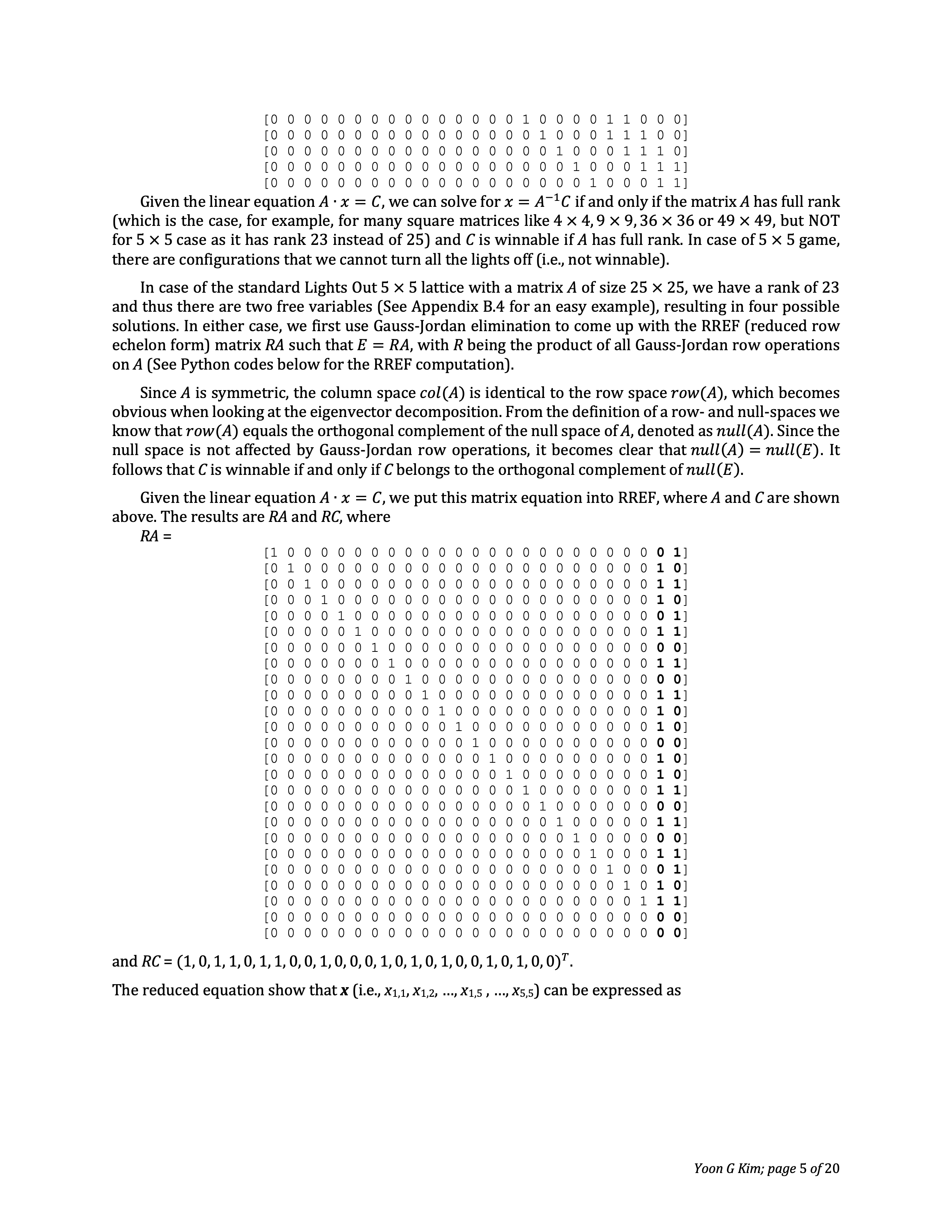 Keywords: XOR operation with binary numbers, Lights Out, RREF (Reduced Row Echelon Form), pivot, null space