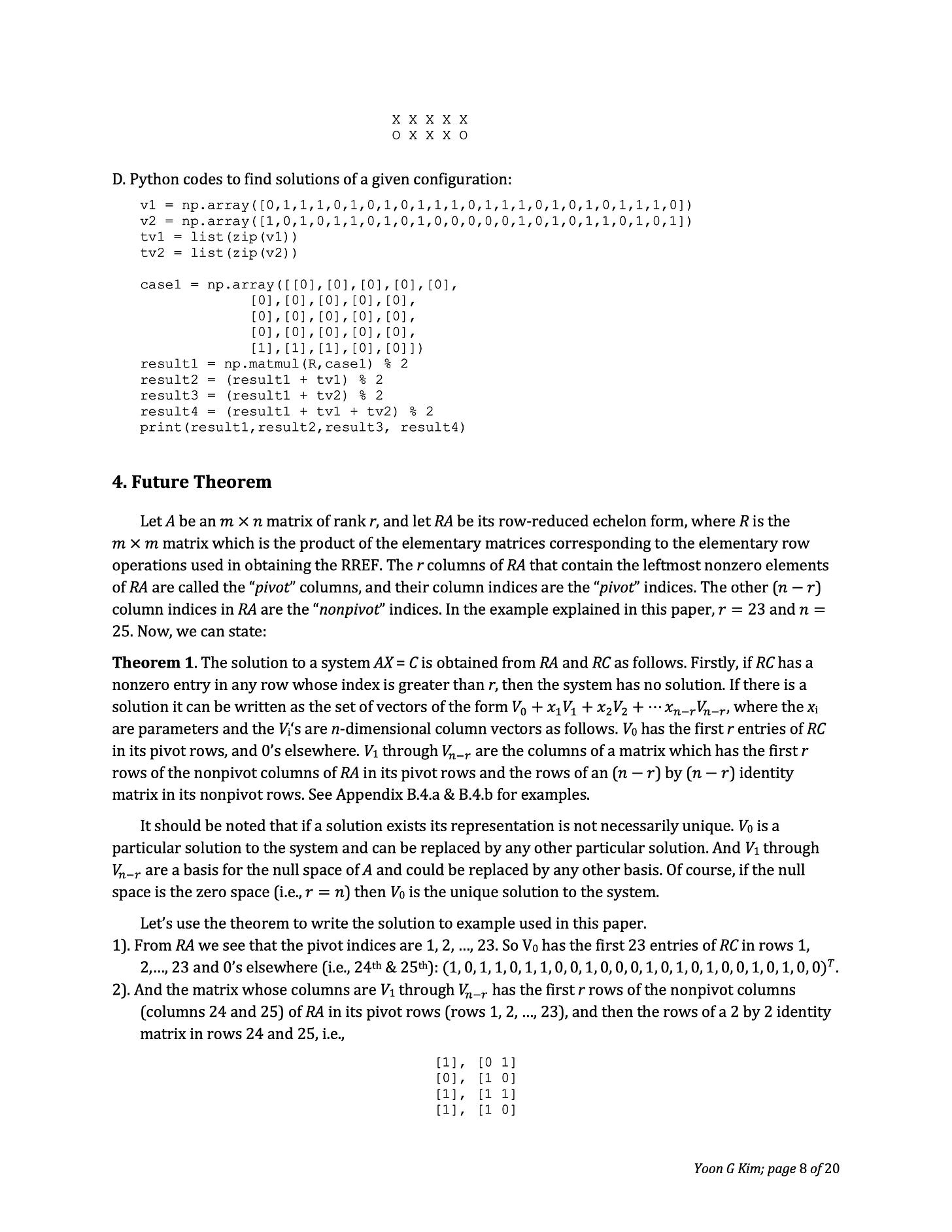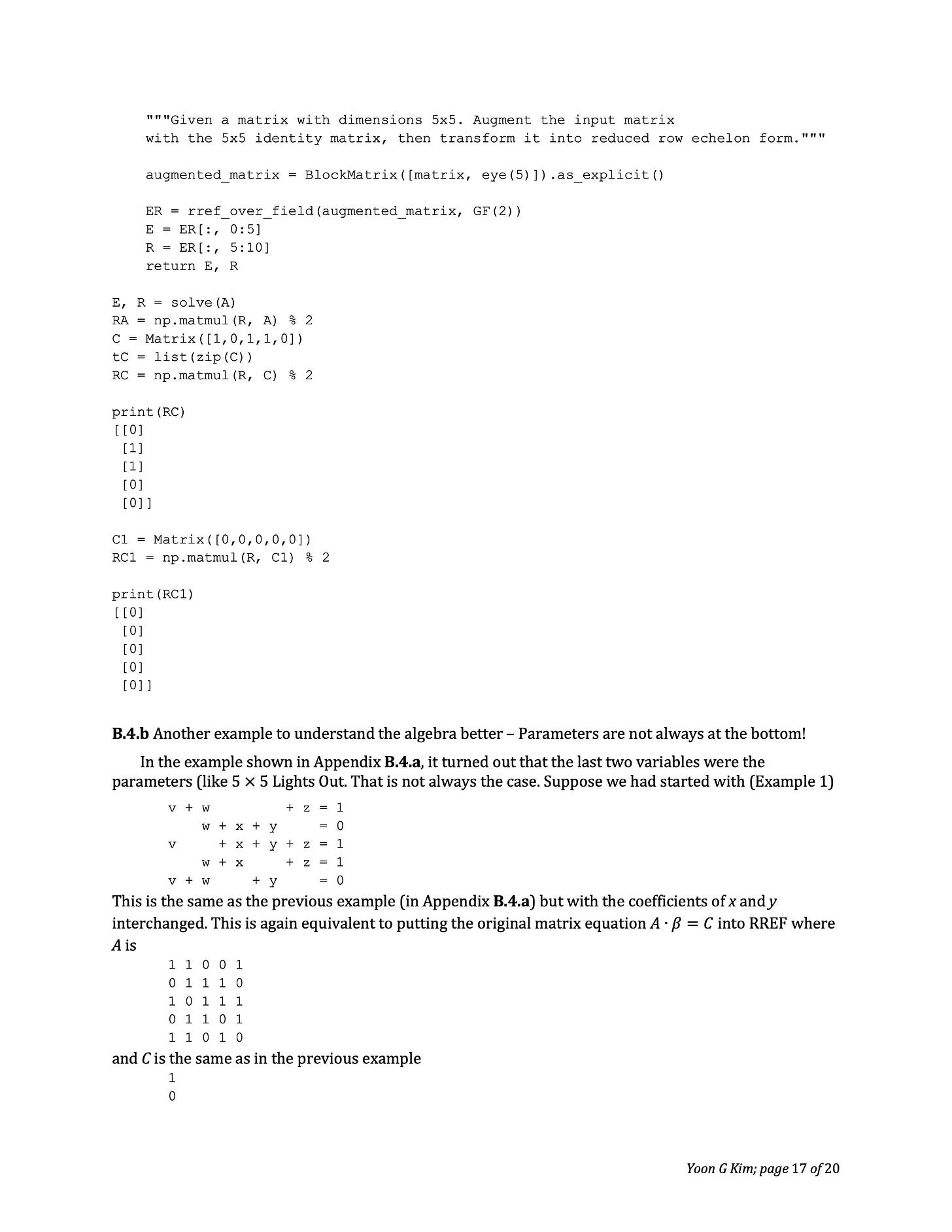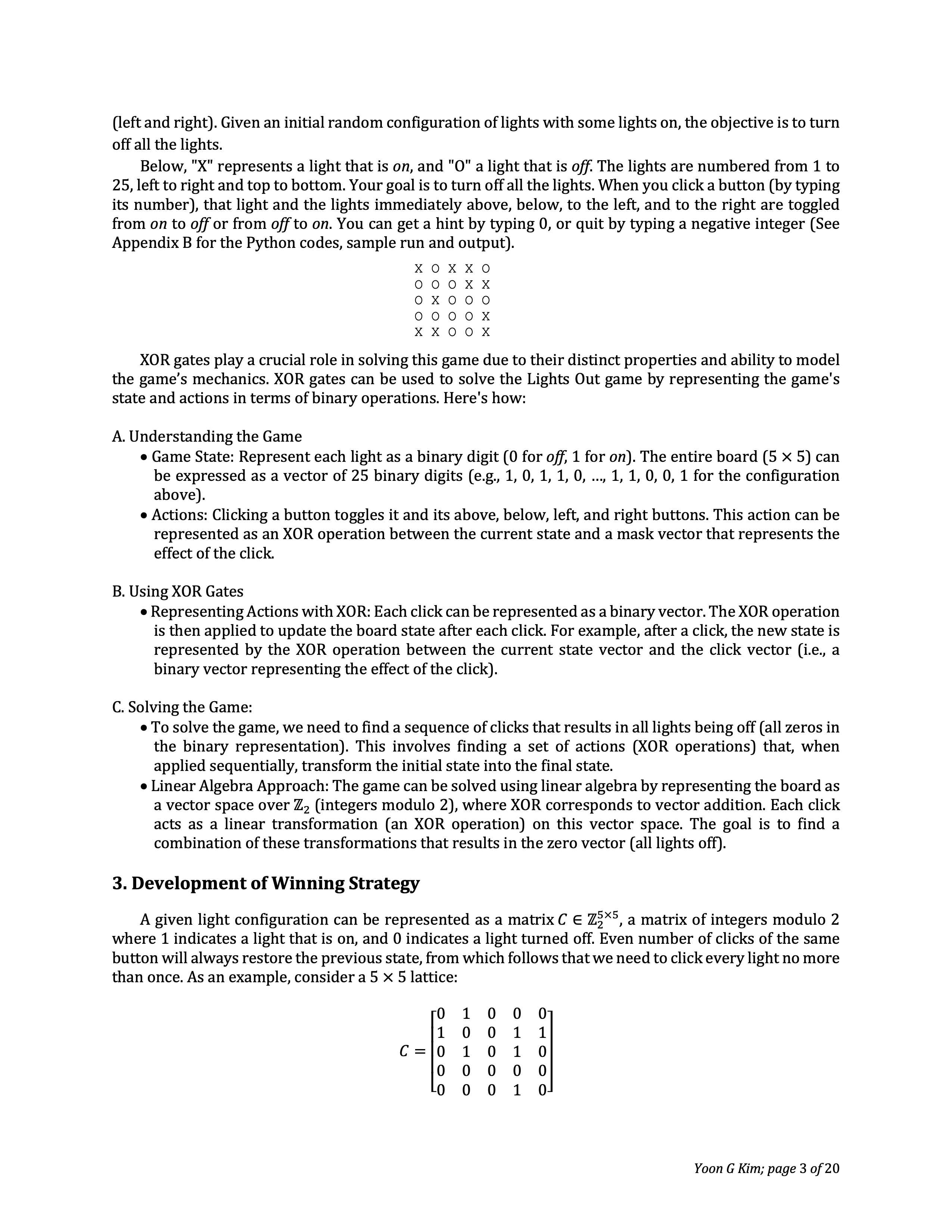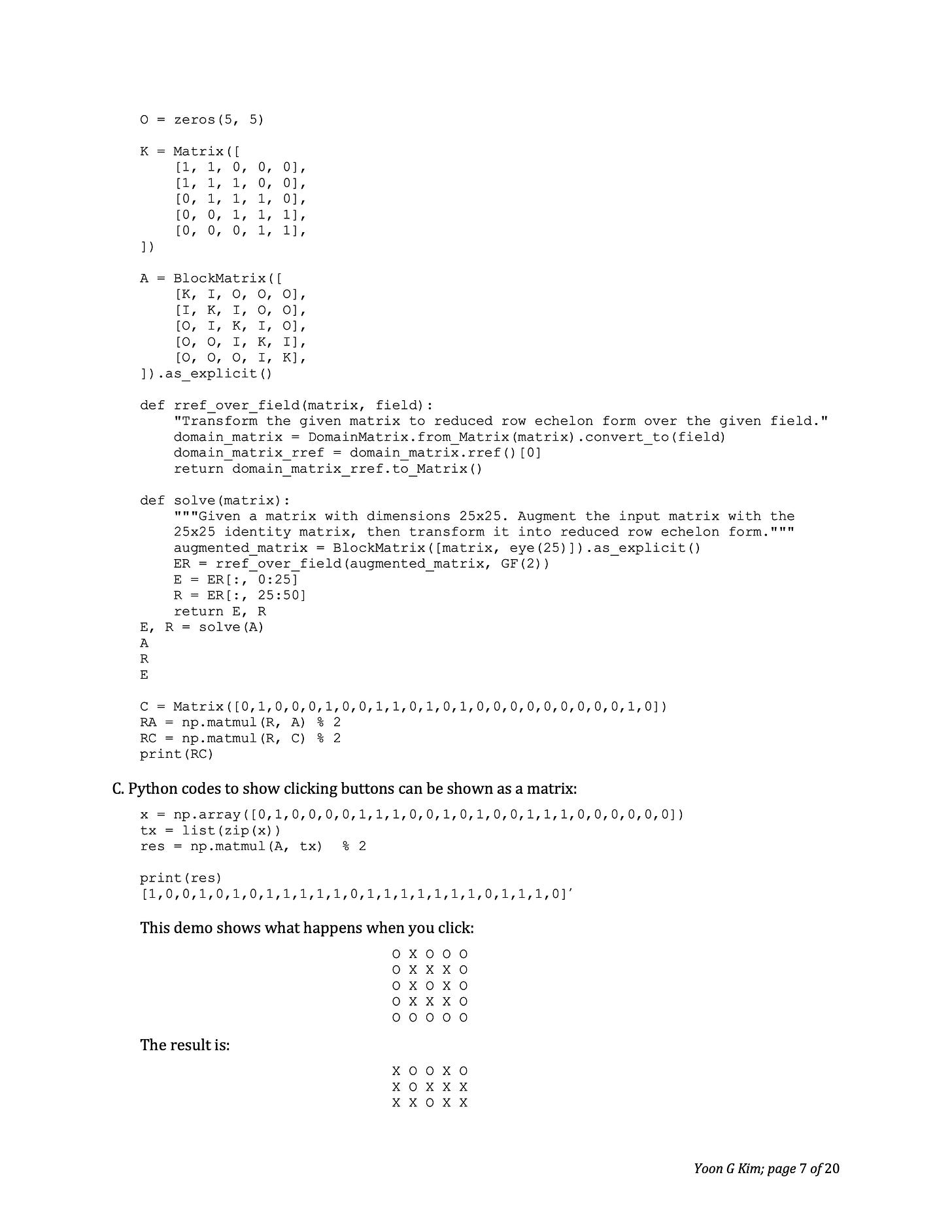 Keywords: XOR operation with binary numbers, Lights Out, RREF (Reduced Row Echelon Form), pivot, null space