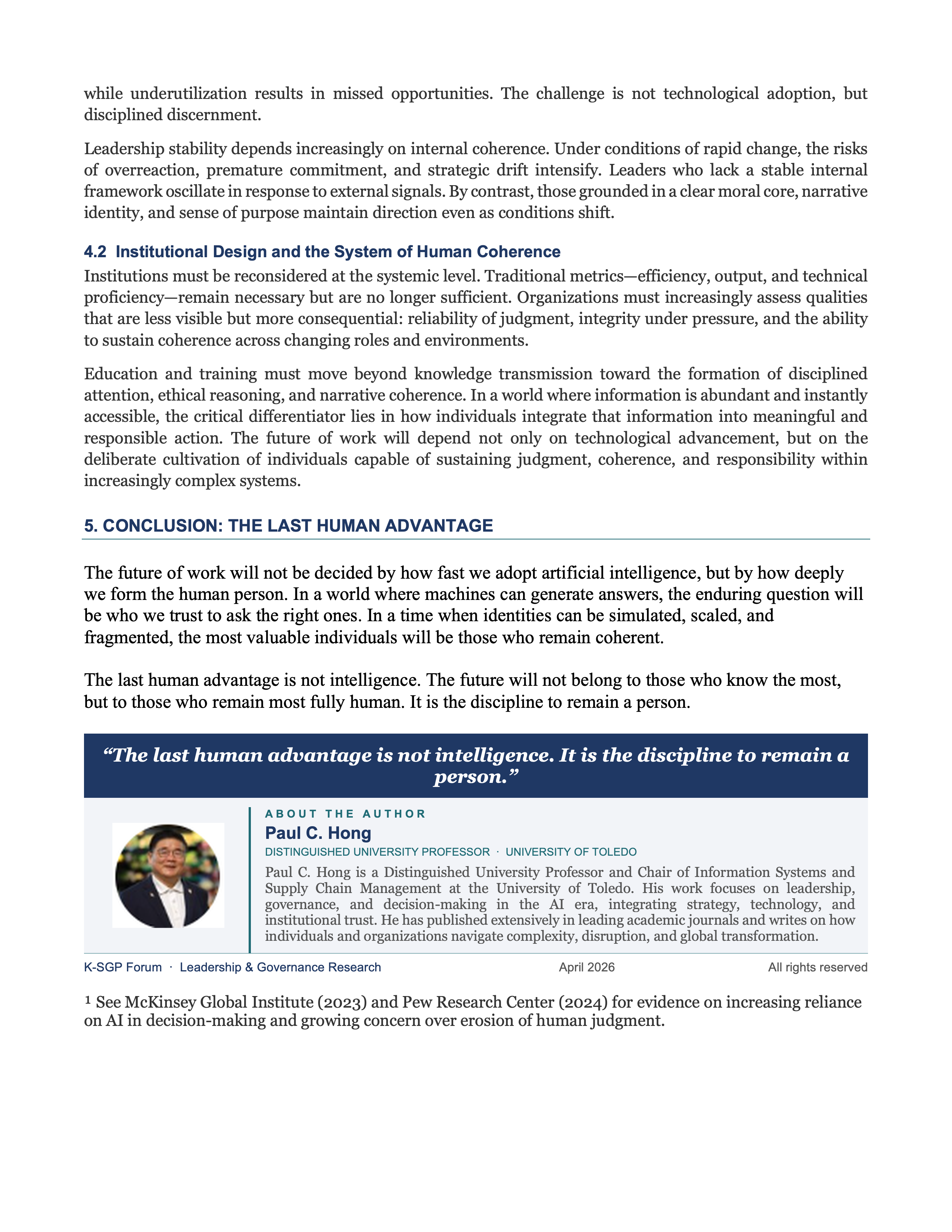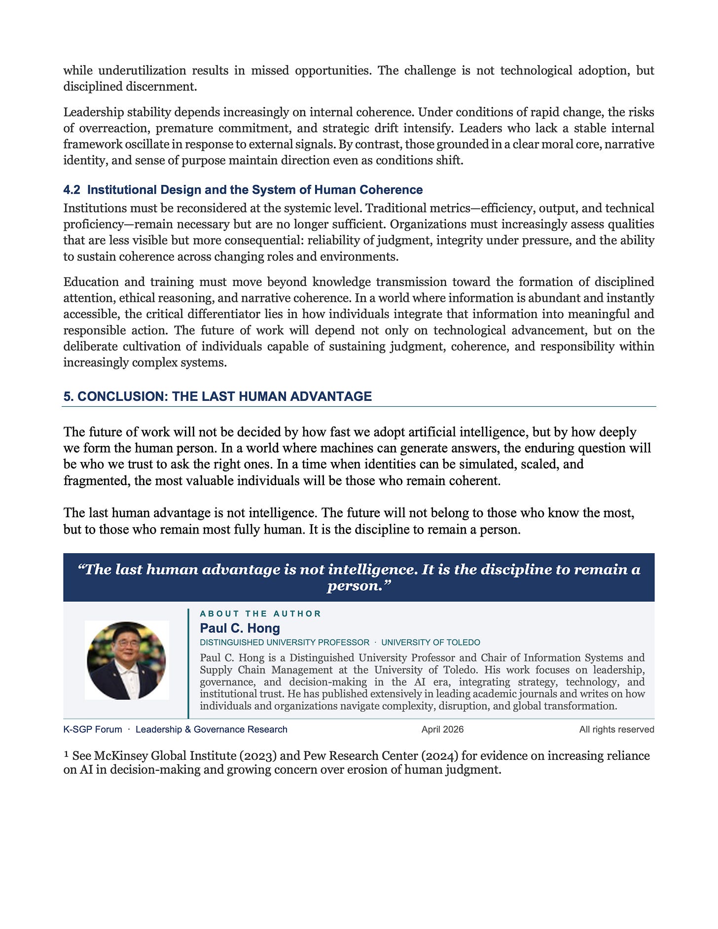 ¹ See McKinsey Global Institute (2023) and Pew Research Center (2024) for evidence on increasing reliance on AI in decision-making and growing concern over erosion of human judgment.
