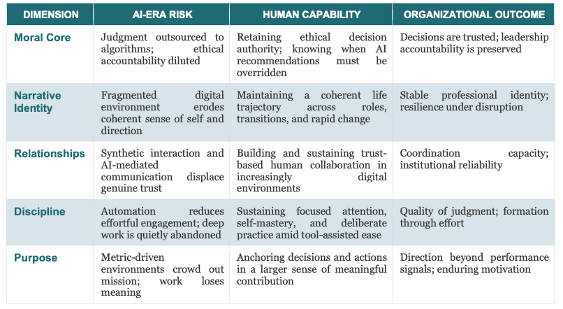 Note: Each dimension functions as an operational capability within modern workplaces — not as a "soft skill" but as a determinant of judgment quality, leadership stability, and organizational coherence under AI-era conditions.