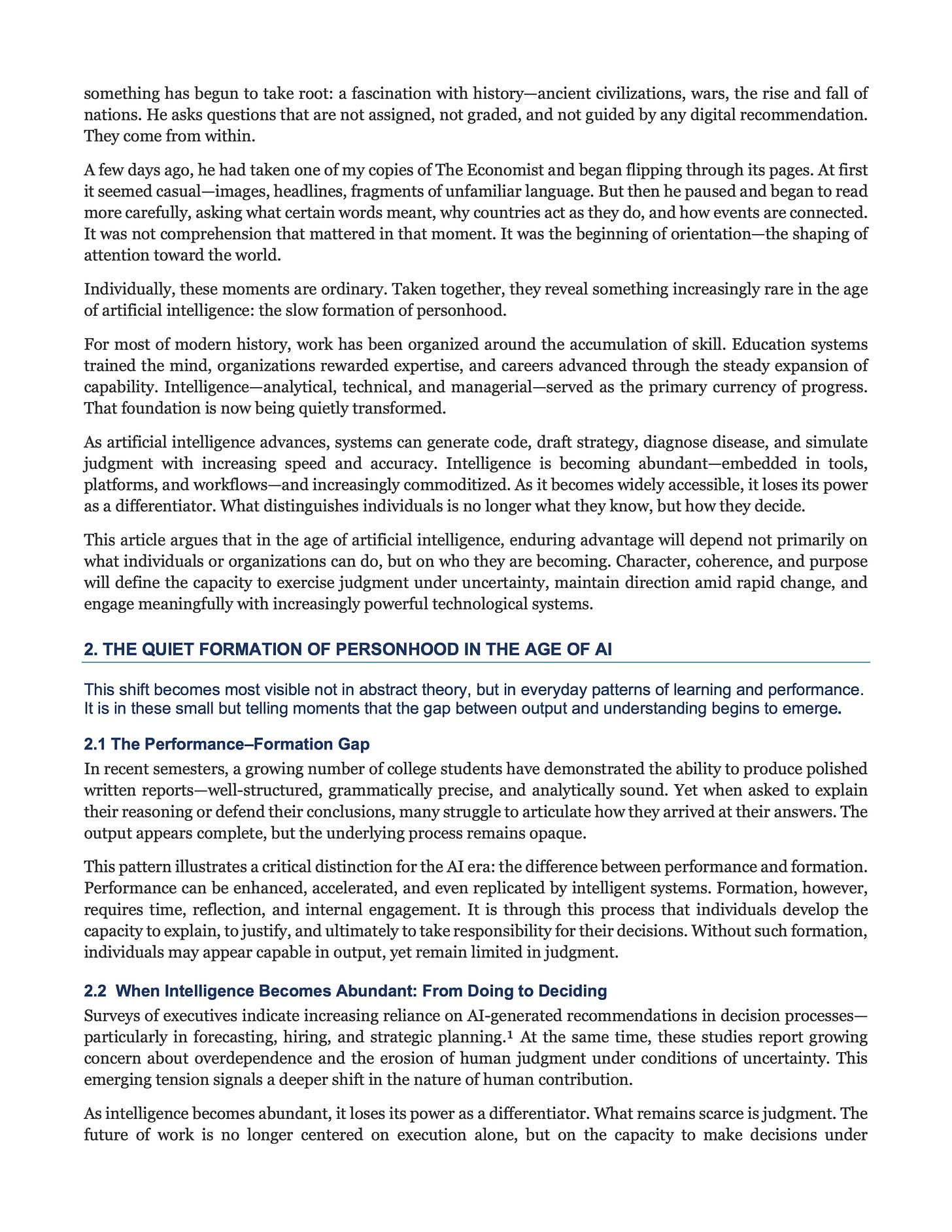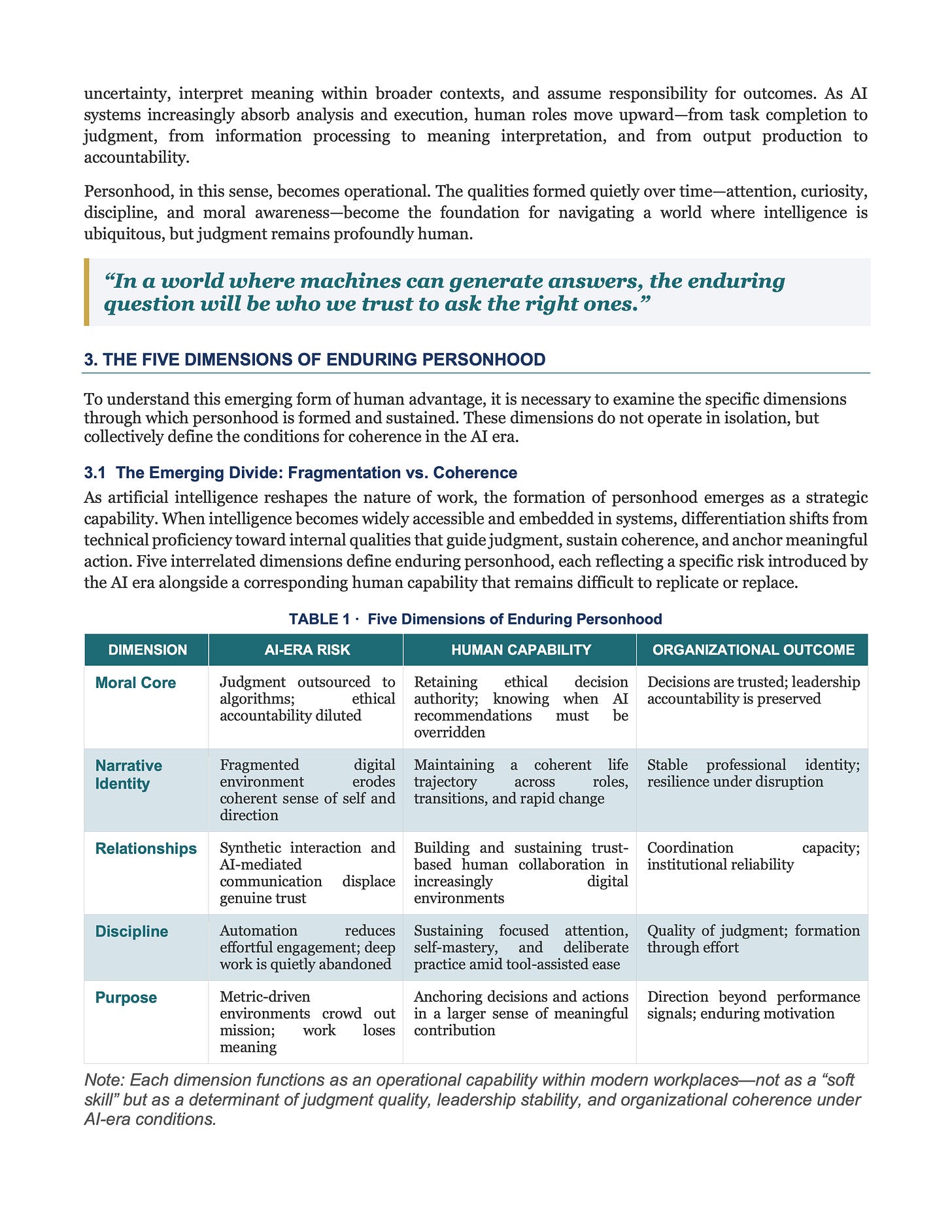 As artificial intelligence expands, advantage moves from intelligence and task execution toward personhood— judgment, coherence, trust, and purpose