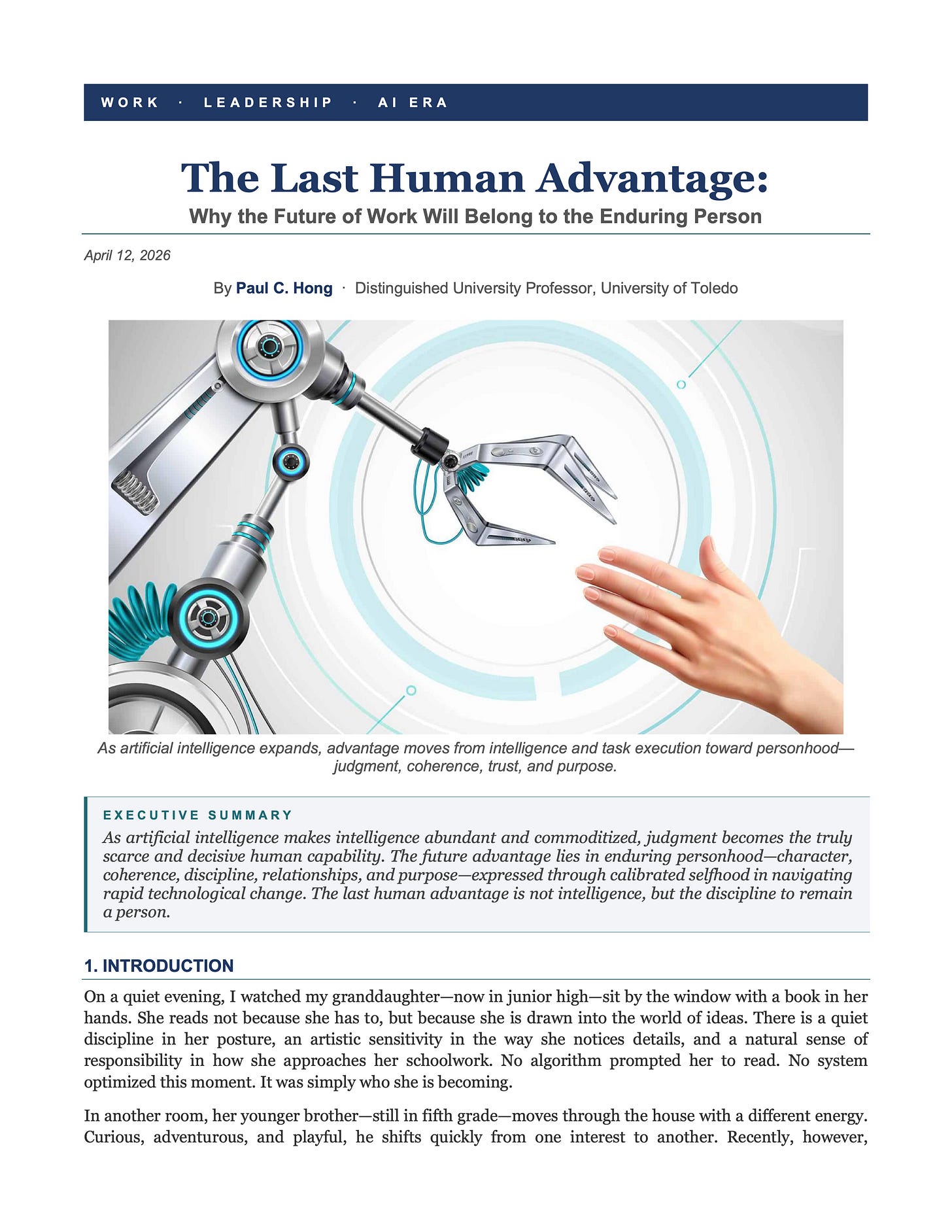 As artificial intelligence makes intelligence abundant and commoditized, judgment becomes the truly scarce and decisive human capability. The future advantage lies in enduring personhood — character, coherence, discipline, relationships, and purpose — expressed through calibrated selfhood in navigating rapid technological change. The last human advantage is not intelligence, but the discipline to remain a person.
