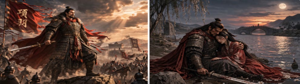 These two images contrast Xiang Yu’s battlefield dominance with his final tragic moment by the river, symbolizing the shift from overwhelming victory to irreversible collapse.