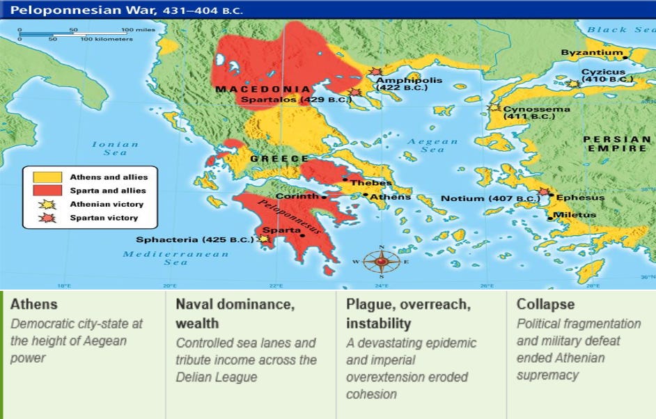 Figure 2. The Peloponnesian War: From Athenian Dominance to Systemic Collapse (Source: Historical map of the Peloponnesian War (public domain/educational use), adapted by the author.)