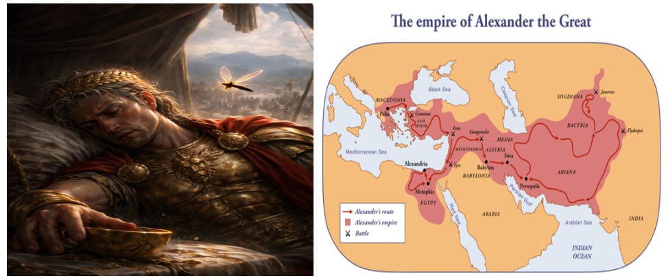 Source: Left image—AI-generated depiction of Alexander the Great; right image—historical map of Alexander’s empire (educational/public domain use); composition and annotations by the author.