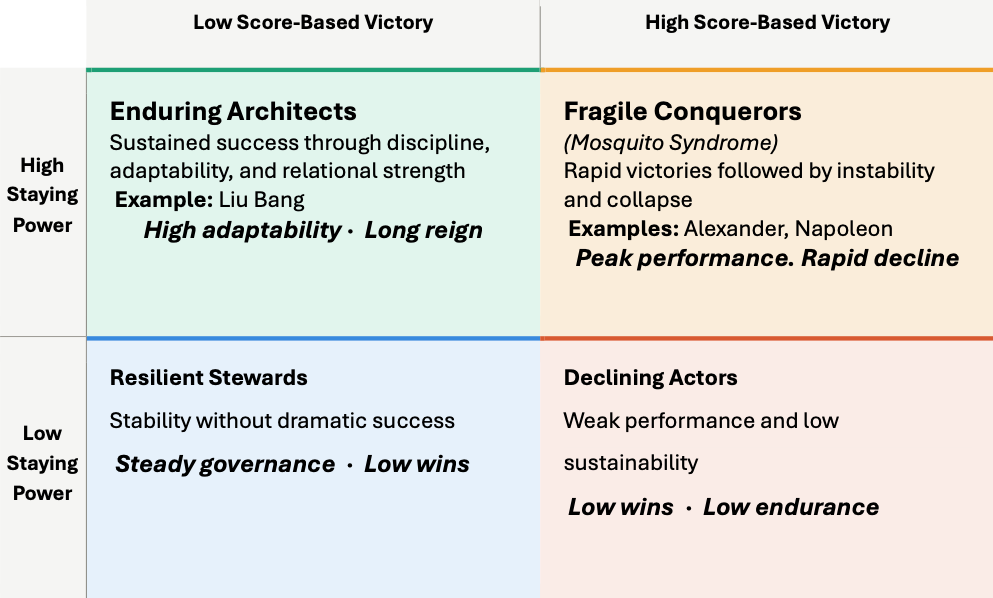 This distinction is captured in Figure 5, which presents a typology of leadership based on two dimensions: score-based victory and staying power. Leaders who combine high performance with strong endurance become Enduring Architects, capable of sustaining success through adaptability and relational depth. In contrast, Fragile Conquerors achieve rapid victories but remain vulnerable to collapse patterns exemplified by figures such as Alexander and Napoleon, where repeated success may reduce sensitivity to emerging risks over time. At lower levels of performance, Resilient Stewards maintain stability without dramatic wins, while Declining Actors exhibit both weak performance and low sustainability.