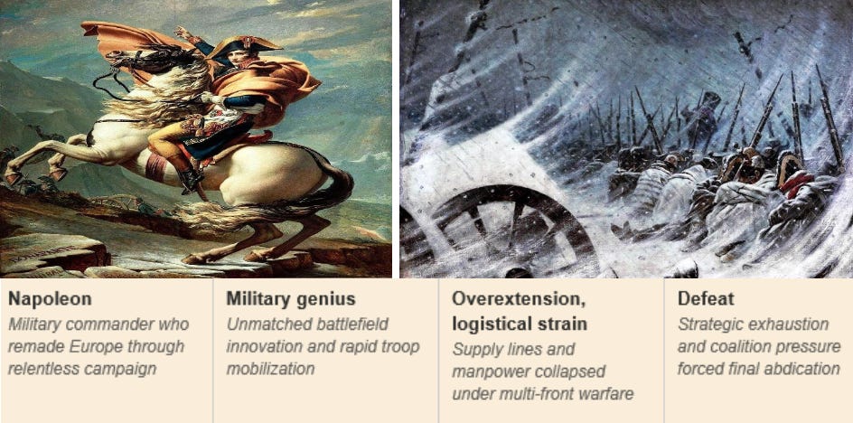 Viewed in this way, the contrast between the two images is not merely symbolic but analytical. The conditions that led to Napoleon’s retreat were not sudden; they were shaped by earlier decisions, structural constraints, and evolving assumptions about control and capability. What appears as a dramatic reversal can therefore be understood as the outcome of incremental pressures that were not fully recognized or addressed.