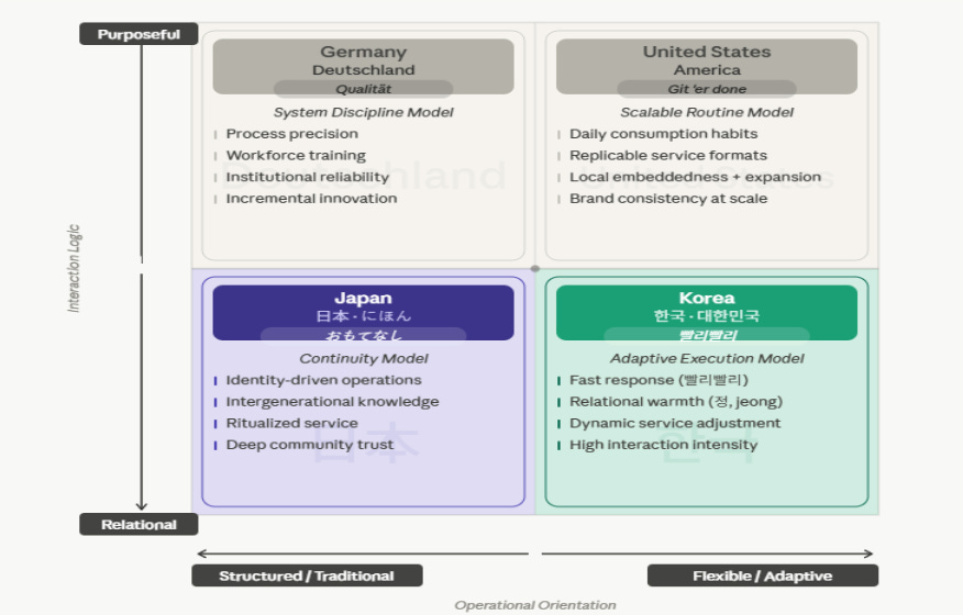 Across advanced economies, enduring firms cluster in essential sectors — food, drink, hospitality, and logistics — where stable demand, repeatable routines, and trust built over time reflect a structural logic of identity-embedded operations and disciplined execution. While pathways differ by context, these firms share a common foundation: they align operational systems with patterned human behavior, embedding their offerings into everyday life in ways that sustain long-term resilience despite technological disruption. Importantly, routine-based consumption is not simply an individual behavioral phenomenon but is socially structured and institutionally reinforced.³ Across countries, differences in cultural norms, interaction styles, and system design shape how routines are formed, maintained, and scaled — demonstrating that endurance arises not from a single formula but from distinct alignments between human interaction patterns and operational systems.